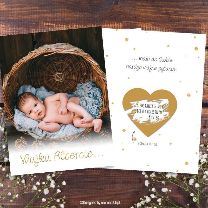 Najważniejsze, aby prośba była wyjątkowa i podkreślała znaczenie tej roli. Kartki ze zdrapkami w kształcie serc, otwierane niczym listy ze skarbami, stają się prawdziwym skarbem, który zachęca do odkrycia tajemnicy. Zachwycająca okładka oraz piękny tekst w środku gwarantują, że przyszły chrzestny poczuje się naprawdę wyjątkowo. Kto mógłby odmówić tak oryginalnemu zaproszeniu do pełnienia tej ważnej roli? Po zdrapaniu powłoki ujawnia się pytanie, które z pewnością wywoła szeroki uśmiech na twarzy zaproszonego!